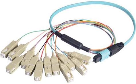 MPO Male To 12X SC Fan-Out, 12 Fiber Ribbon, OM3 10G 50/125 Multimode, OFNR Jacket, Aqua, 1.0m